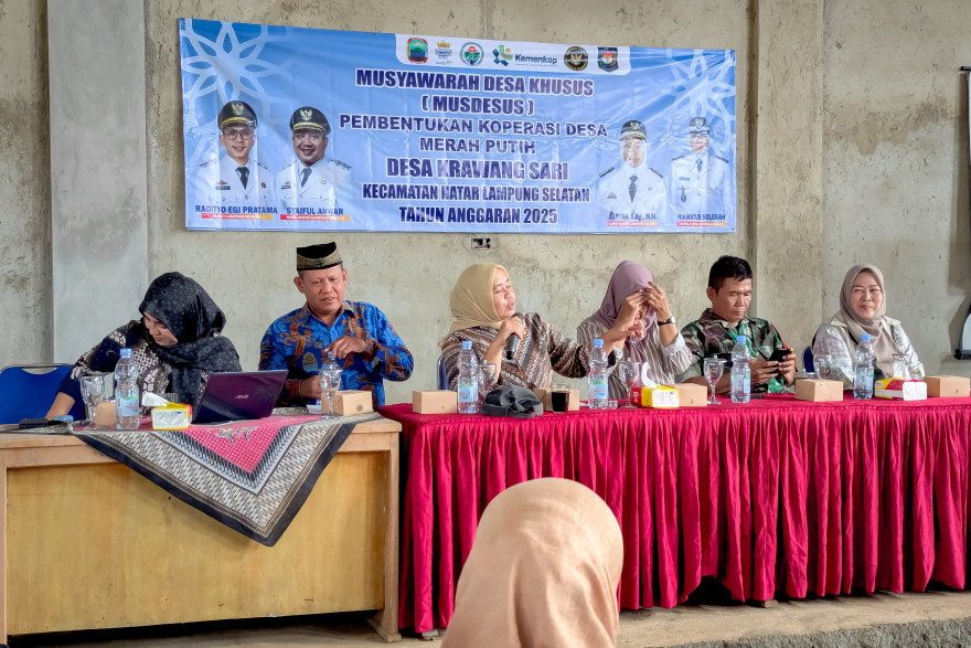 Musyawarah Pembentukan Pengurus Koperasi Desa Merah Putih di Krawang Sari Kecamatan Natar Pada tanggal 17 Mei 2025, bertempat di Aula Balai Desa Krawang Sari, telah dilaksanakan Musyawarah Desa Khusus (Musdesus) dengan agenda pembentukan pengurus Koperasi Desa Merah Putih Desa Krawang Sari. Musyawarah ini merupakan tindak lanjut intruksi presiden No 9 Tahun 2025 tentang Percepatan Pembentukan Koperasi Desa Merah Putih. musyawarah ini dihadiri oleh Camat Kecamatan Natar Ibu Supi'ah, S.Ag., M.Si., Kepala Desa Krawang Sari Ibu Nikmatus Solekah, Selurah Perangkat Desa Krawang Sari, Ketua dan Anggota BPD, Ketua RT, Kader Posyandu, Pendamping Desa,Pendamping Lokal Desa